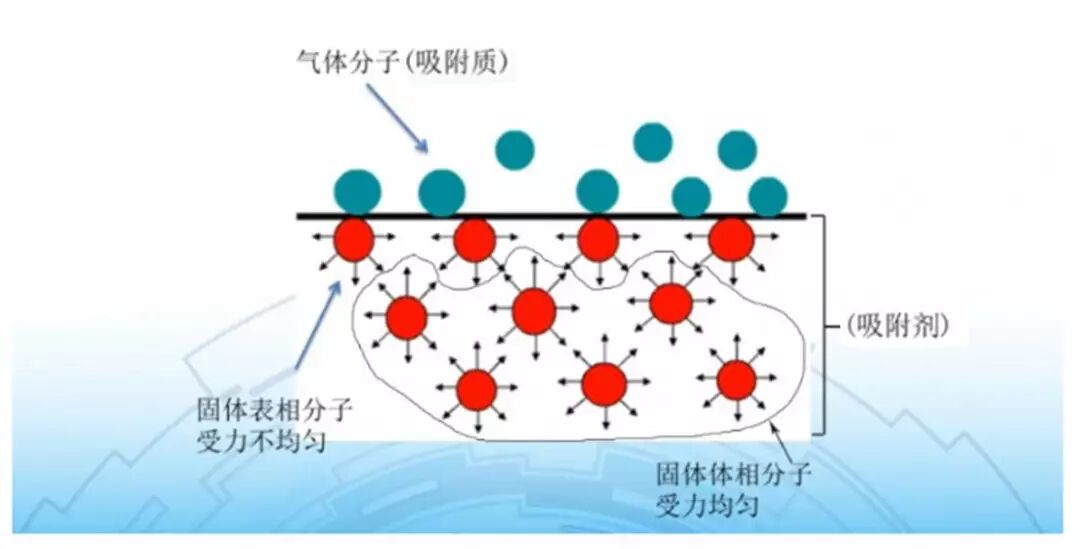 固相(吸附剂)体相分子受力均匀,而表相分子受力不均匀,于是会寻找气体分子(吸附质)吸附于表面,使表相分子受力均匀,处于平衡状态。这就是吸附现象产生的原因~其中,具有吸附能力的物质被称为吸附剂,而被吸附在吸附剂表面的物质称为吸附质。