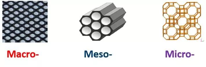 图用于吸附分离的大孔(Macro, 直径 > 50nm)、介孔(Meso,2nm-50nm)、微孔(Micro,直径 < 2nm)多孔材料
